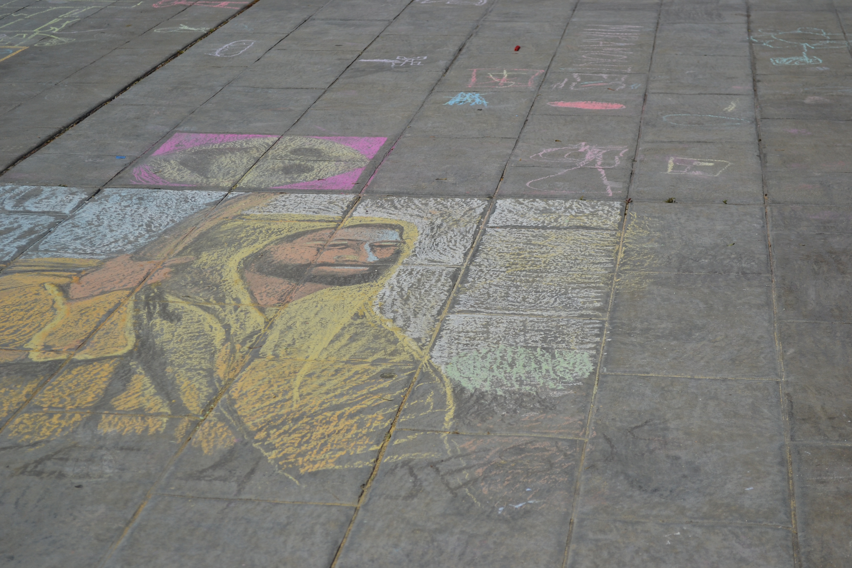 As I walked around the open plaza, I observed the young and young at heart artists create wonderful displays of artistic expressions with chalk. I even enjoyed in the chalk art activity along with a few of my colleagues. The theme of the event was all about the spring season. There are many things that we associate with spring such as sunny skies, blooming flowers with great aromas and green pastures. We look forward to all these great qualities every year and as we all may agree, nature is always a great inspiration for art, and as I walked around snapping photos, I saw artists drawing flowers, sunrises, and Easter eggs. I also saw some pieces that were quite exceptional- cartoon characters, a building skyline, a rendering of Christ, detailed flowers to name a few. There were so many different activities that the public could partake. The Arts Council had coloring pages for kids, there was a raffle to win prizes and treats, a boutique and massages for adults, face painting, drawn self-portraits, and of course lots of chalk.