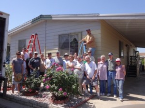 A recent widow was overwhelmed with support and help from Magnolia Presbyterian Church volunteers on Saturday at Village Riverside Mobile Home Park. After playing a game of “where is Kathy”, our Project Manager, and starting about an hour and half late, they were able to finish the paint job by 12:30pm. As you can see, Magnolia Presbyterian Church volunteers are a great crew and not rookies of Habitat for Humanity Riverside’s A Brush with Kindness program.