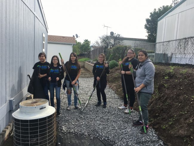 On February 11th, the Ramona High School Habitat Chapter joined us at the Villa Corona Mobile Home Park in Corona to help complete a project for our homeowners John and Yvonne. Several weeks ago John and Yvonne’s yard was cleared and prepared to be filled with rock by another volunteer group. Twelve volunteers, including students and faculty members, from the campus chapter joined us to lay the weed barrier in the yard, transport and disperse the rock, and even completed a few small repair projects. The students of the Ramona High School Campus Chapter are rock installation professionals so this was a relatively easy task for them.